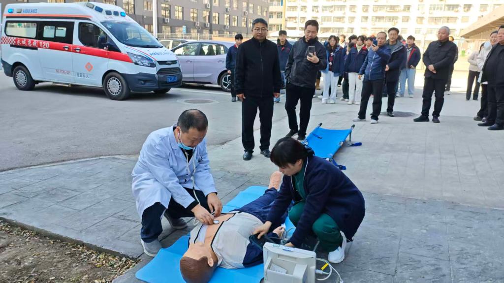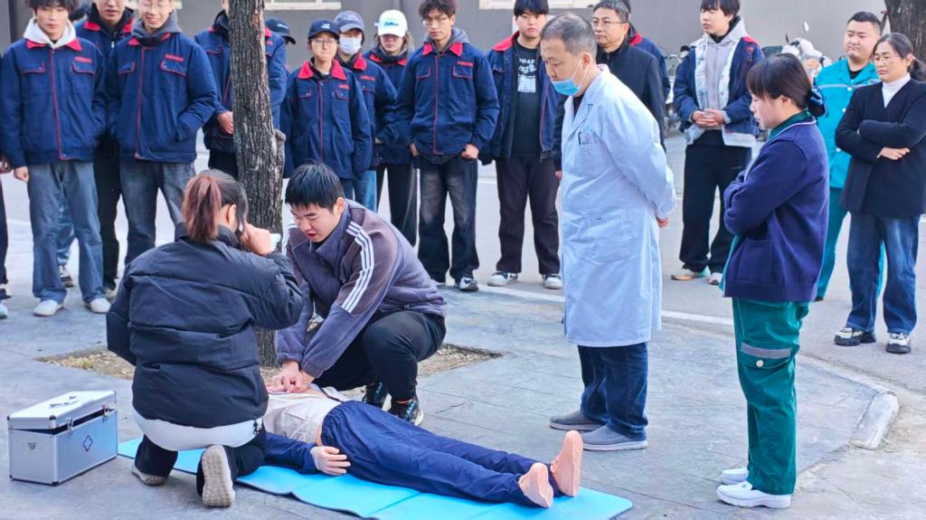 心肺复苏:沉着应对科学施救。具备急救资质的同学现场演示了对无意识、无呼吸“伤员”的心肺复苏(CPR)操作,包括判断患者意识、呼救、胸外按压、人工呼吸等关键环节,强调了操作过程中的注意事项,如按压的位置、频率和深度等。